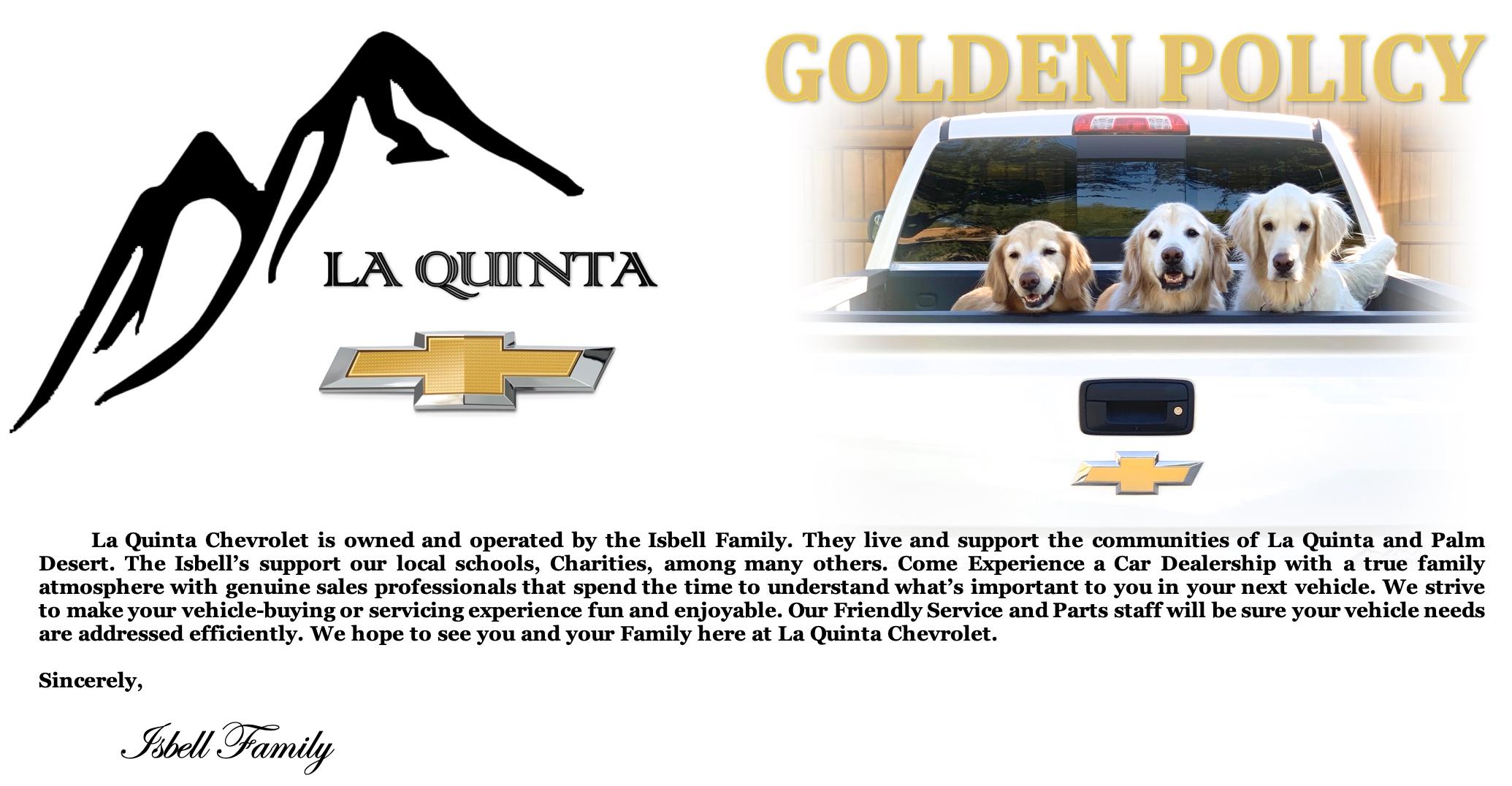 Not all car dealerships are created equal, and here at La Quinta Chevrolet, we pride ourselves on being a cut above the rest with our unrelenting commitment to customer service. From our hometown of La Quinta CA to the nearby communities of Palm Springs and Coachella, we're proud to have worked with folks from all walks of life. Whether you're seeking the perfect new Chevy Silverado 1500 or new Chevy Tahoe for sale near Palm Springs, shopping on a strict budget for a used car at our Chevy dealership near Cathedral City, searching for that perfect financing deal, or even looking for a service and parts center near Coachella you can trust, we're confident you'll find that our dealership is a great resource for all your automotive needs.